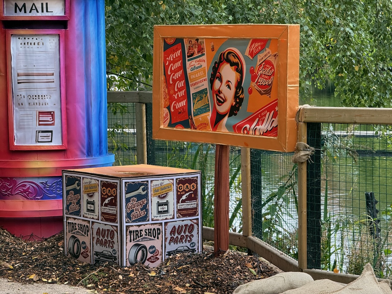 Then there's the cube in front of the world's biggest mailbox, with automotive-themed posters on it. Those are not actually GenAI output -- I have no idea where they originated, but there's various shops online selling those.